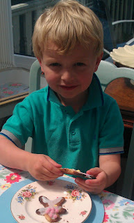 R made me chuckle as she asked if we could "display" the offerings for Daddy. Learning so young that cake eating can be made 'an event' when put on a pretty plate! She promptly chose a heart shaped plate for the heart biscuits and another for the lemon drizzle.... ahh... so much nicer than shoving a tin on the table!!
