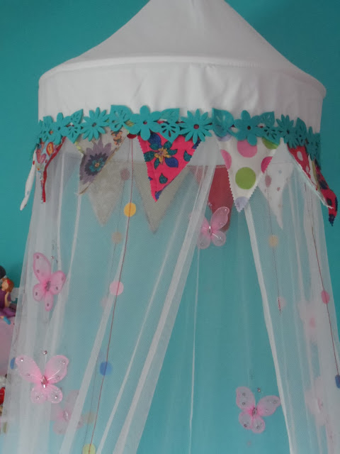 The canopy is a basic IKEA number which I've prettified - the original bunting clashed with the bedroom colours so I replaced them with material from my stash and added a teal felt cut out border to the top edge to hide my workings and help it stand out a bit more.