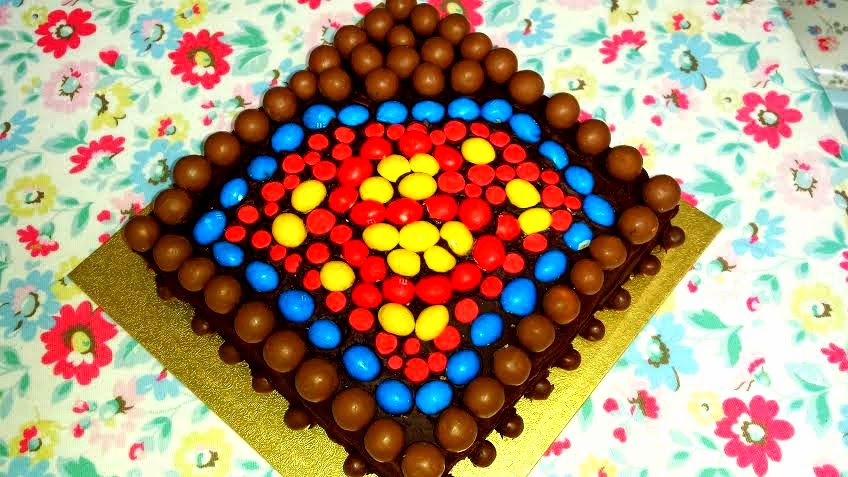 I remembered a cake I'd pinned an age ago here and felt inspired to recreate it.  I did buy two bags of M&M's (in hindsight smarties would have been better) from the local shop and sorted them into separate colours - I had 2 bowls of yellow and blue sweets but there were only 8 red ones in the two packets combined!!  I cut them in half length ways to make them go further and then to avoid spending more money I coloured up some fondant icing to make up the rest of the shield (again, a store cupboard ingredient).