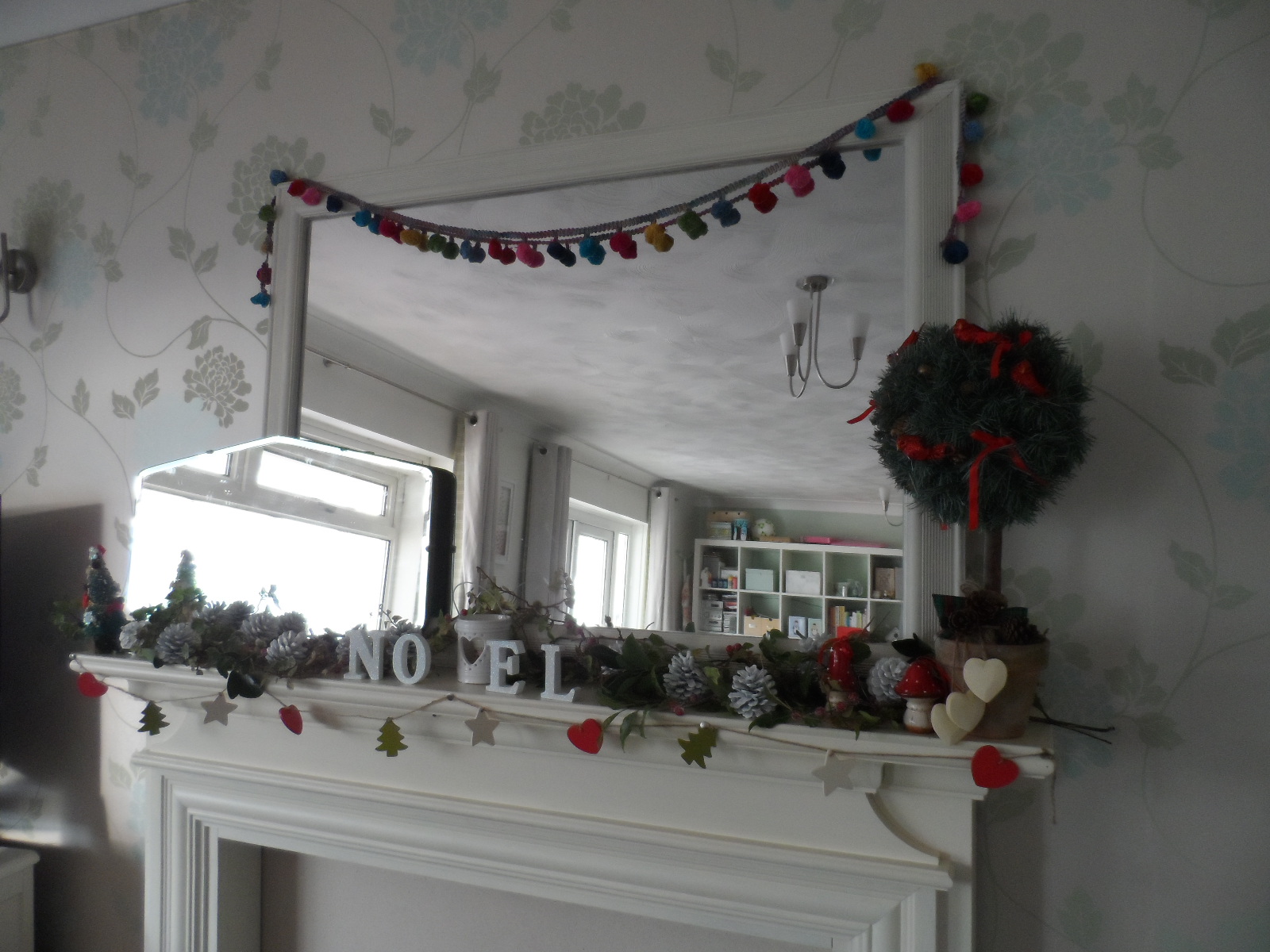The autumnal colours have been removed from my mantelpiece and a thoroughly festive theme now takes centre stage. Apologies for the poor light in this photo - the grey skies in Somerset at the moment make indoors so gloomy - but you get the idea! My favourite bit is the pompom garland (which I actually bought for a trim for a furniture makeover I've got planned!!)