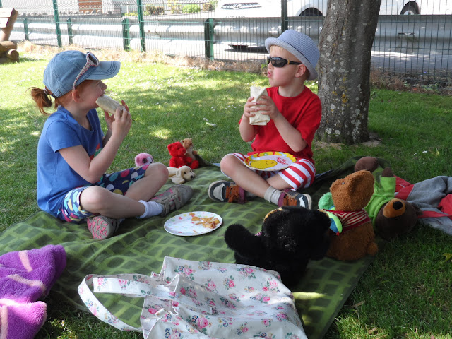 So last Saturday (when the sun shone unlike this past weekend) we took a picnic to the local park and let the children pack a bag of toys they wished to take... A football, skipping rope, Famous Five reading books were grabbed first. In our house, the current obsession seems to remain on cuddly toys. They chose five of their favourites to share in the afternoon activity with us.
