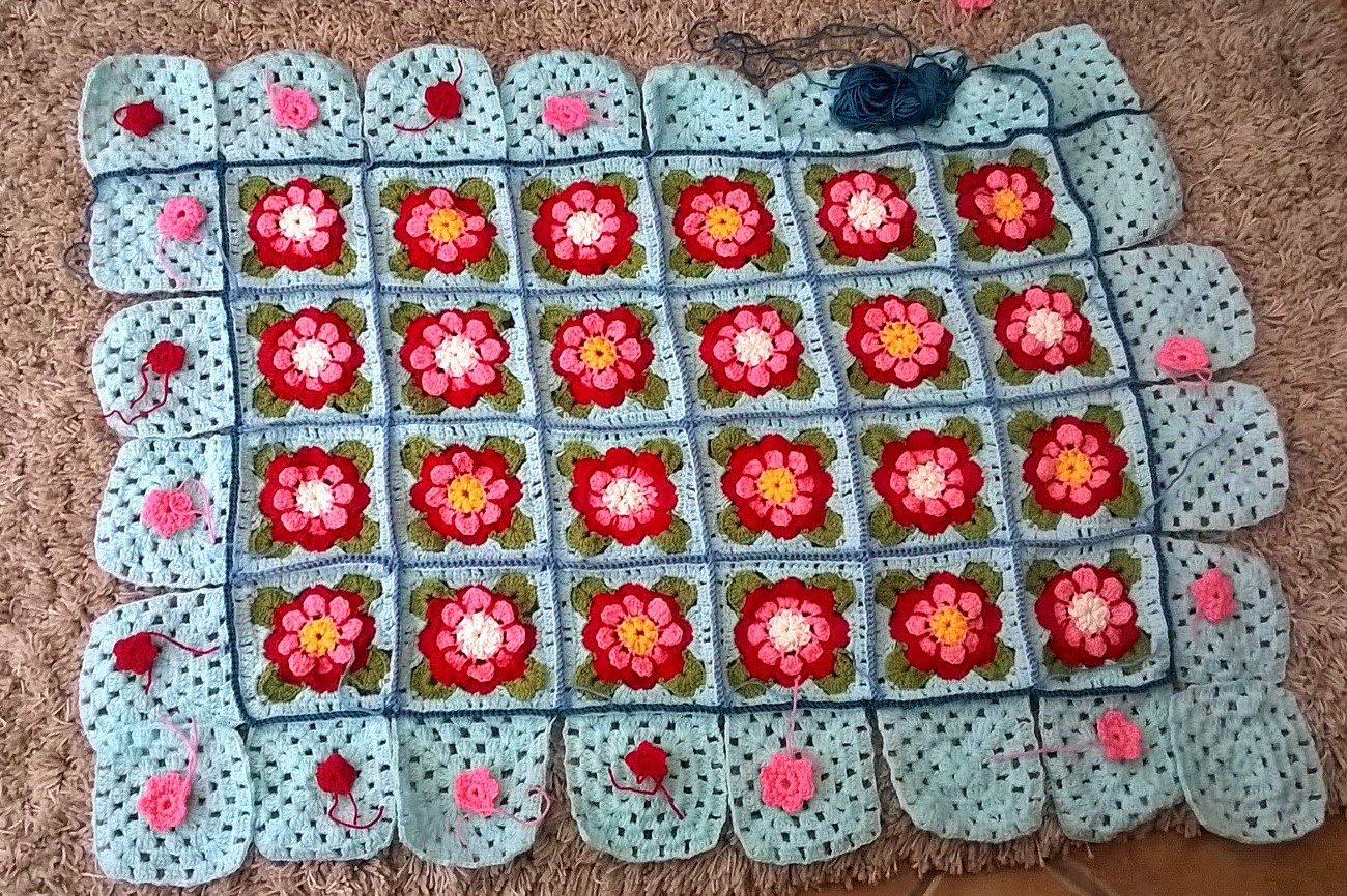I have joined the squares with yarn that I had in my stash (purely to make this blanket a little more thrifty) and I am now at the stage where the edging needs to be crocheted.
