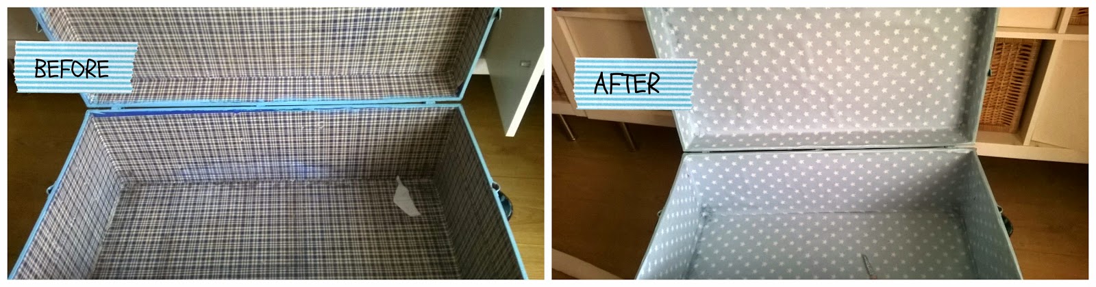 The inside of the trunk was given a fresh coat of lining paper - some Cath Kidston blue star paper I had from a long time ago!!  This gave a really smart and practical finish to the trunk, which on reflection was a very frugal upcycle!!!